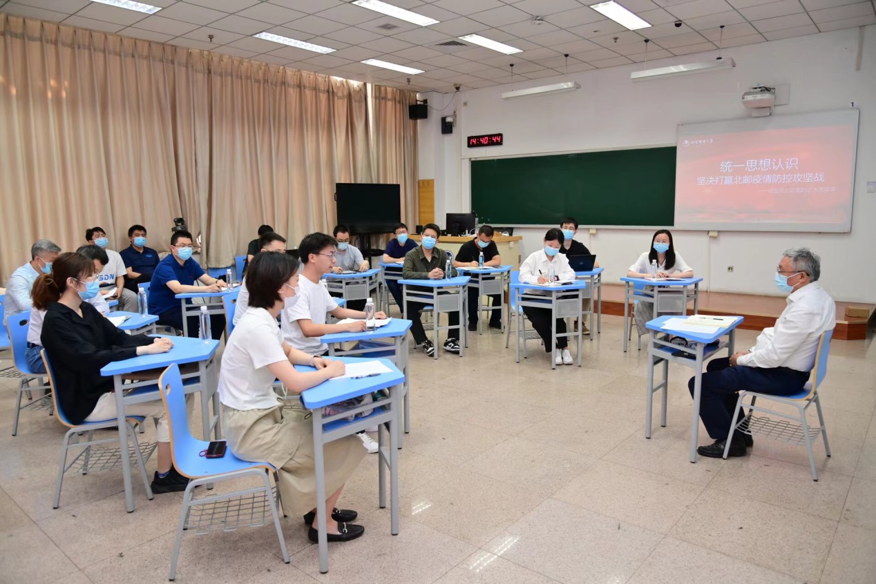 吴建伟指出,面对北太平庄街道周边疫情,学校迅速响应,立即行动,发扬连续作战精神,压紧压实校园疫情防控责任,切实筑牢校园安全屏障,全力守护师生生命安全健康。一是不断优化管理方案,提升应急处置能力。组织开展多轮全要素分场景实战演练,加大校园巡查力度,加强应急能力储备,通过信息化手段加强人员摸排、流调溯源和重点人员检测,加大环境消杀力度等,最大程度降低传播风险。二是发挥党团组织优势,动员师生积极参与。广大党员干部、青年教师组建教职工应急志愿服务队伍,积极参与校园和家属区核酸检测等防控工作。三是坚持“以师生为中心”,做好医疗后勤服务保障。密切关注师生涉及疫情防控相关诉求,每日调度并及时通报,开通24小时服务热线“62281234”和网上一站式服务平台,校医院开通发热及常规病患诊治转运专用通道。四是加强宣传思想引导,不断凝聚抗疫正能量。按照“正面引导、释疑解惑、主动服务、回应诉求”工作方针,将思想政治工作融入疫情防控全过程。五是校内校外上下齐心,确保学校各项工作正常运转。统筹做好疫情防控和教育教学等各项工作,高度重视就业工作。六是发挥学校特色优势,织密织牢疫情防控网。组建“校-院系部门-班”三级管理组织架构,实现分层分级落实网格化防疫要求,利用技术手段加快流调和风险排查的速度及准确度。
