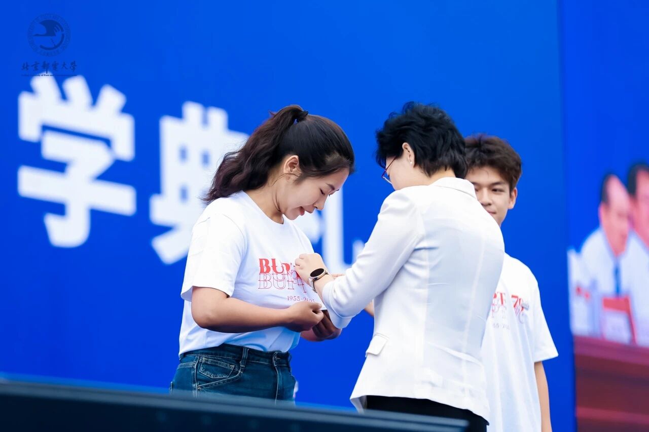 续梅为新生代表佩戴校徽并赠送新生礼物“邮小北”2.0版。全体新生庄重地将校徽佩戴于胸前,标志着正式成为光荣的北邮人,肩负起“传邮万里 国脉所系”的时代使命。新生礼物“邮小北”2.0版由北邮师生团队自主设计研发,集成NFC一键直达新生网页、智能U盘存储及AR校园全景漫游等多项功能,以“钥匙”为核心意象,通过“春夏秋冬”不同景致,寓意学校四季陪伴新生成长。
