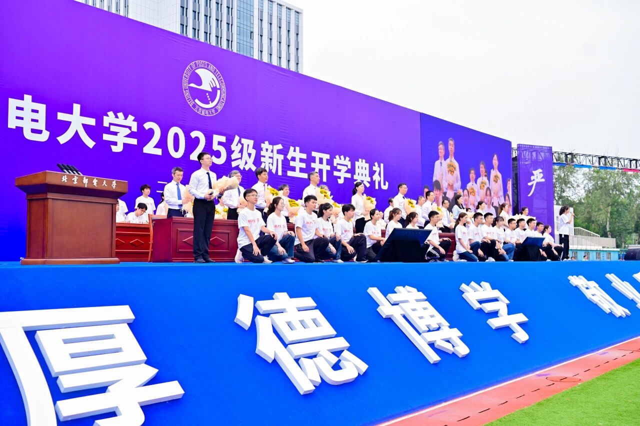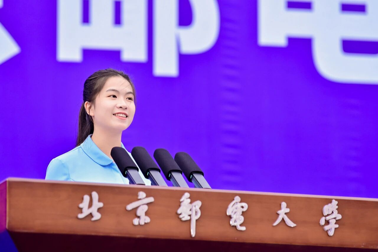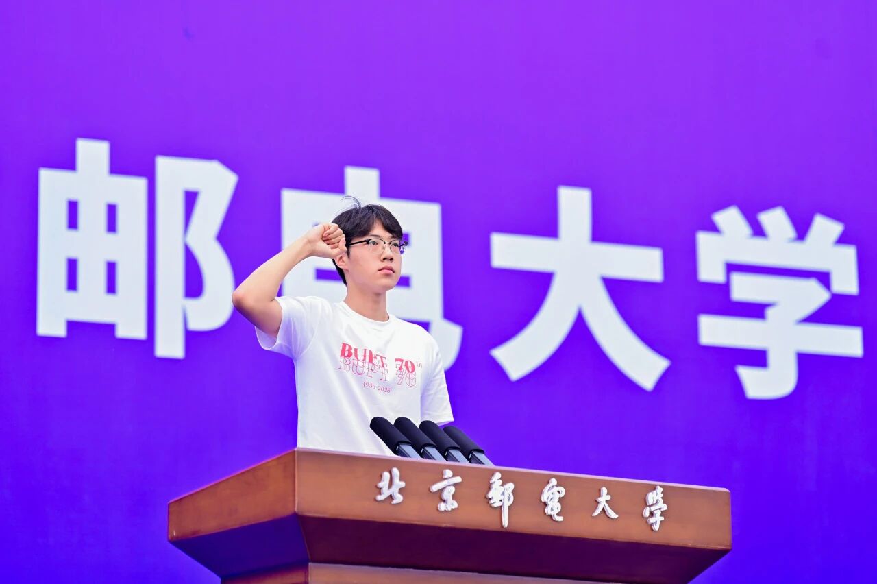 入学宣誓仪式上,全体2025级新生郑重立下“厚德博学,敬业乐群,不负韶华,青春‘邮’我;崇尚奉献,追求卓越,未来开创,奋进‘邮’我;传邮万里,国脉所系,时代使命,担当‘邮’我。七秩荣光,邮启新程。展智慧之翼,扬鸿雁之姿,为强国建设、民族复兴,我们时刻准备着!请党放心,强国有我!”的青春誓言。