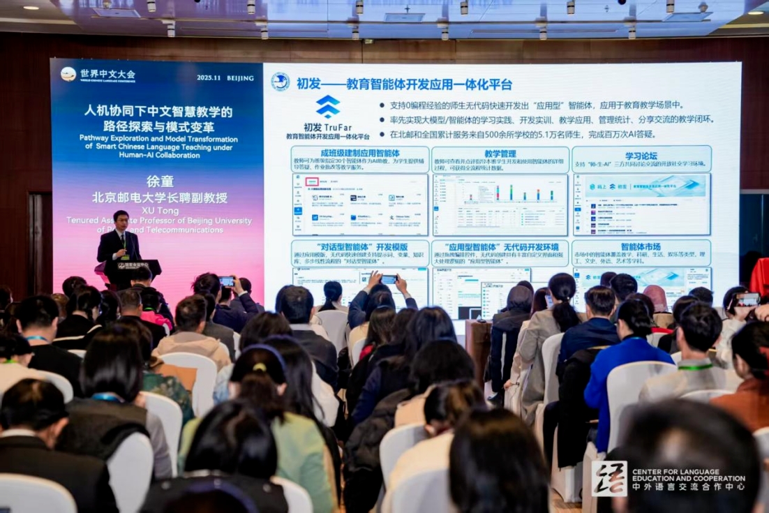 北京邮电大学计算机学院(国家示范性软件学院)长聘副教授徐童在“线上线下融合的无边界中文学习生态构建”平行会议上作了题为《教育智能体及其在国际中文教学中的应用》的报告,介绍了学校在智能技术赋能教育变革方面的理论与实践探索。