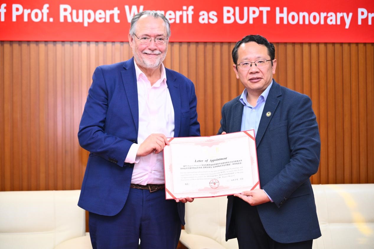 鲁珀特·韦格里夫对北邮教育数智化转型取得的成绩给予高度评价,并介绍了剑桥大学未来数字教育中心的建设进展。他表示,很高兴获聘北邮名誉教授,期待双方面向智能时代的教育变革所需,不断加强优势资源整合和学术交流合作,为全球教育创新提供新方案、注入新活力。